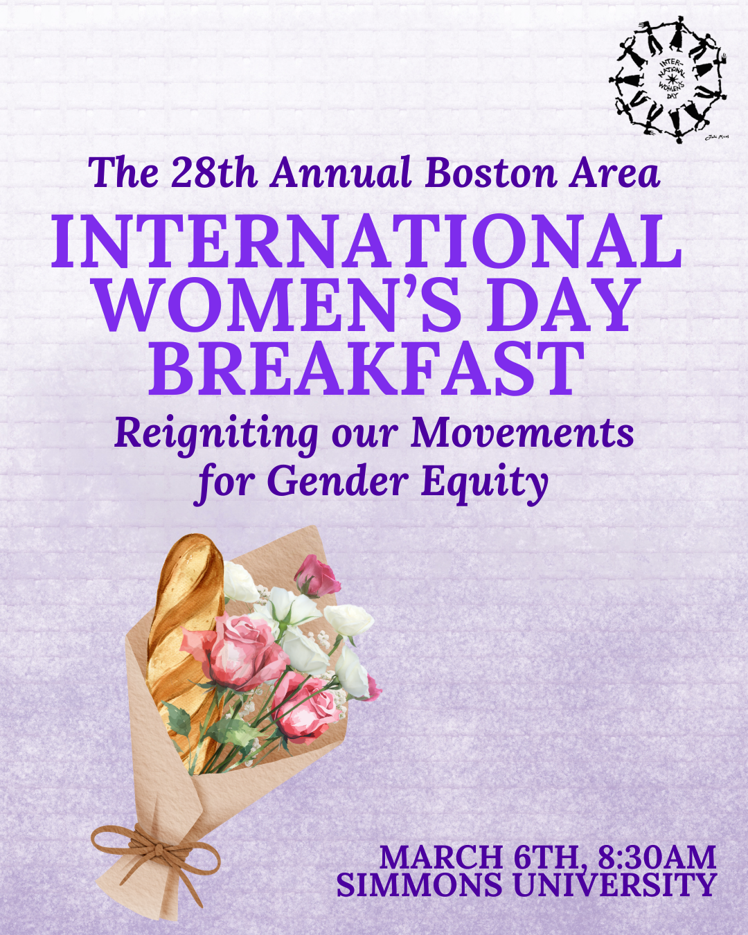 Join feminist organizations from across Greater Boston for a morning of inspiration, connection, and action at the 28th Annual International Women’s Day Breakfast. The theme for this year is Reigniting our Movements for Gender Equity. The breakfast includes a resource fair with 20+ community organizations, light bites and coffee, a keynote, and a panel.