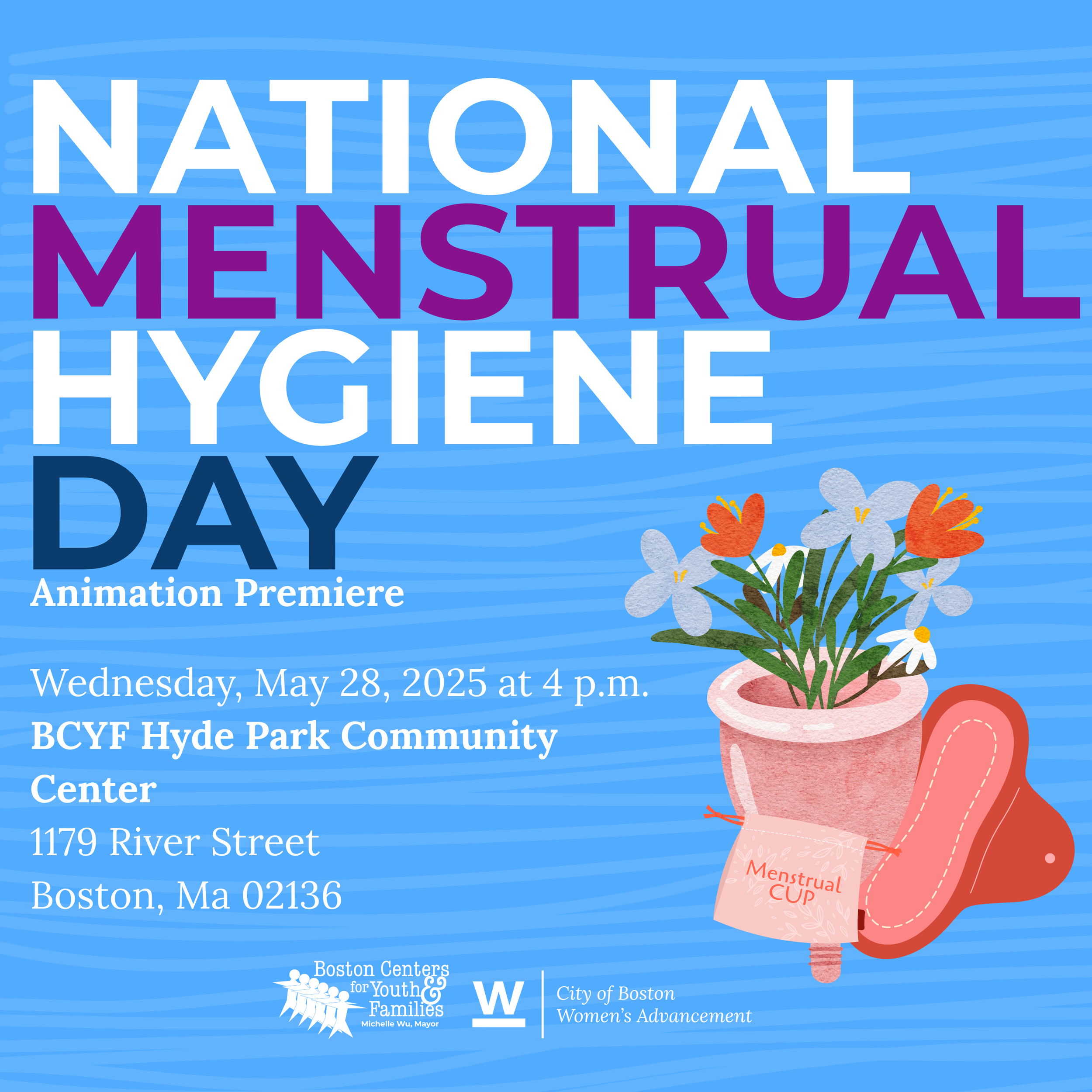 On National Menstrual Hygiene Day, join us for the launch of our vital Menstrual Equity Animation and Training Series! We're continuing our menstrual equity workshop series from 2023 by creating an engaging animated series that demystifies menstruation, providing clear and accessible education for all. Simultaneously, we're initiating crucial menstrual equity training for city staff, starting with BCYF, to foster a more informed and supportive community. Discover free menstrual product resources and join us in breaking down stigma and building a future of menstrual equity.