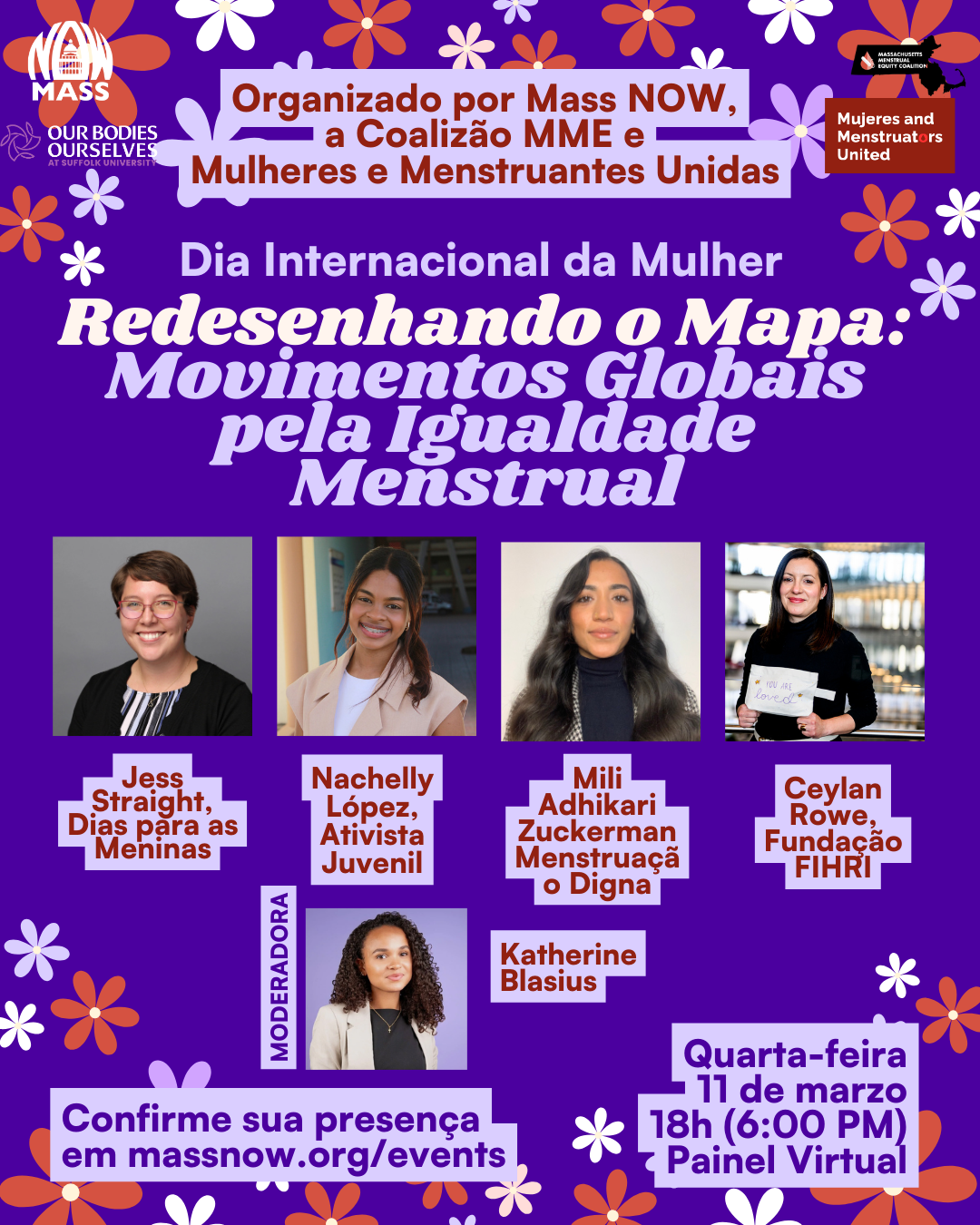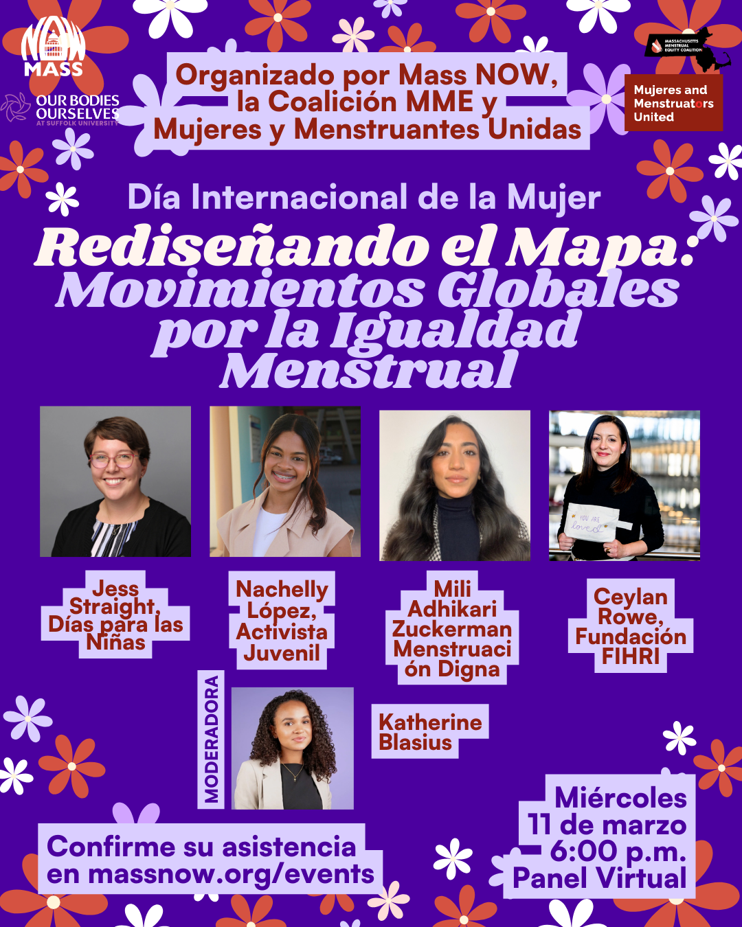 Join Mass NOW, the MME Coalition and Mujeres and Menstruators Untied Coalition for an International Women's Day virtual panel on: Redrawing the Map: Global Movements for Menstrual Equity. Tune in to hear from activist and organizers that are championing the menstrual equity movement globally!
