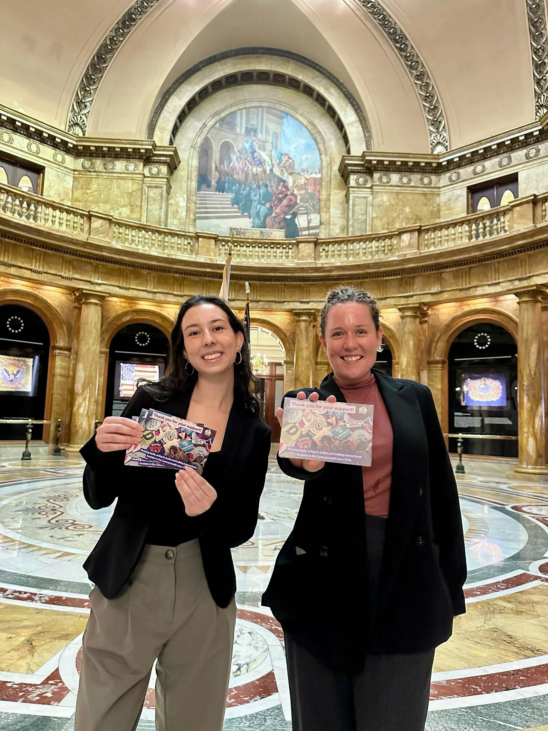 Sasha Goodfriend (right), Executive Director, and Nicole Lockhart-Rios (left), Policy and Event Planning Co-op, dropping off post cards in the State House
